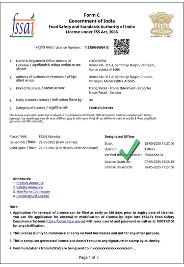 We are proud to be certified by the Food Safety and Standards Authority of India (FSSAI), ensuring that all our food products meet national safety and hygiene benchmarks. Our Import Export Code (IEC) empowers us to trade internationally, and our APEDA accreditation reflects our compliance with export standards for agricultural and processed food products.